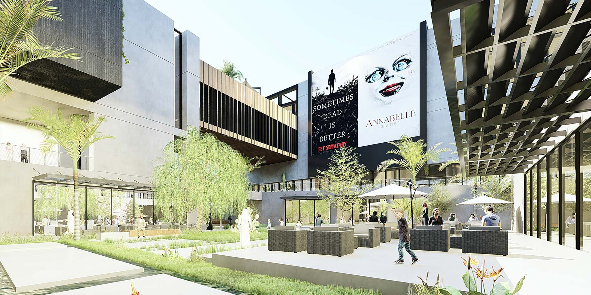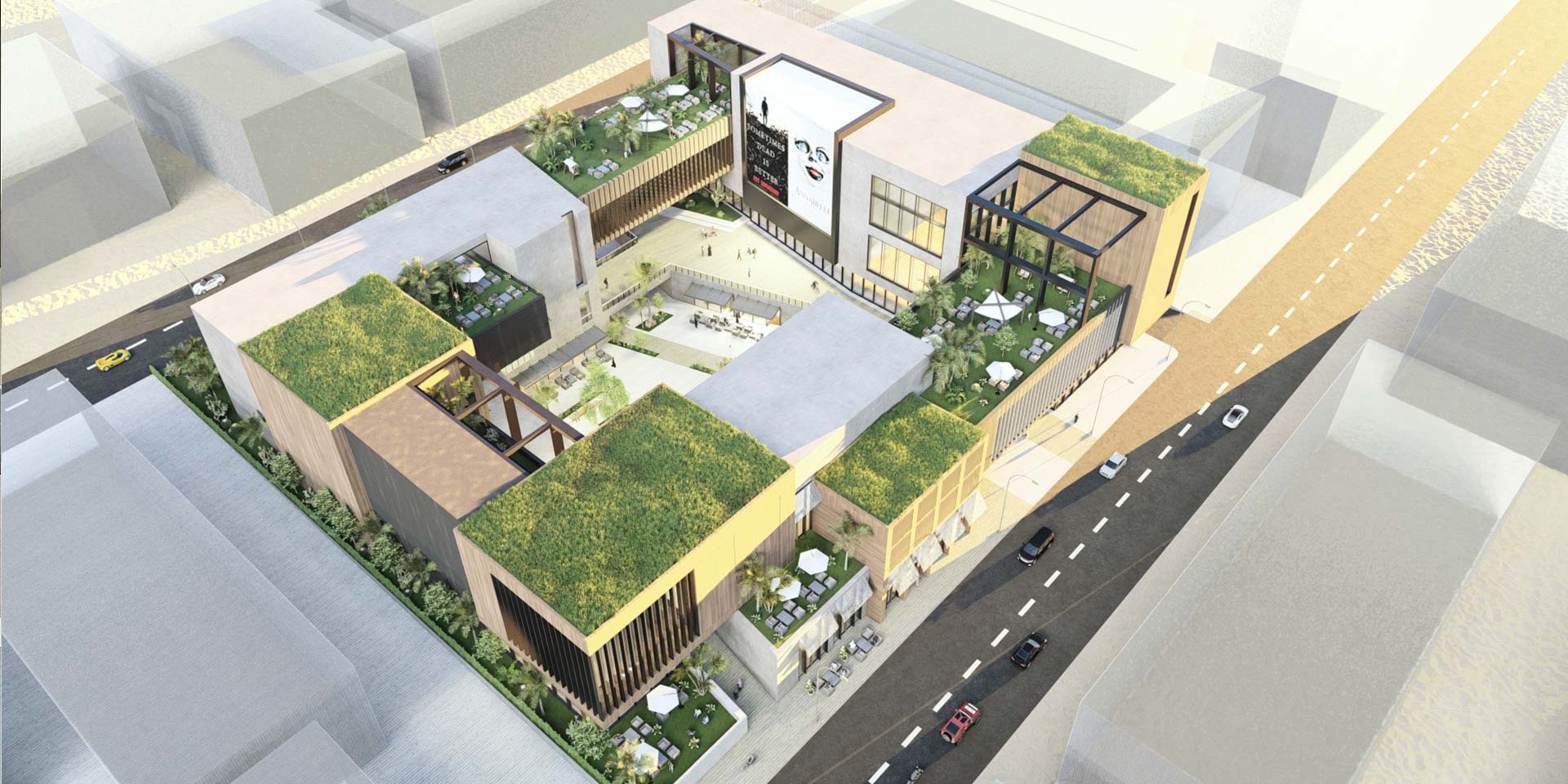 Composed around a central hub, the project deploys itself in a fragmented architecture that allows the heart of the project to shine as a junction amidst mixed functions, ranging from a movie theatre, to shops and open spaces.