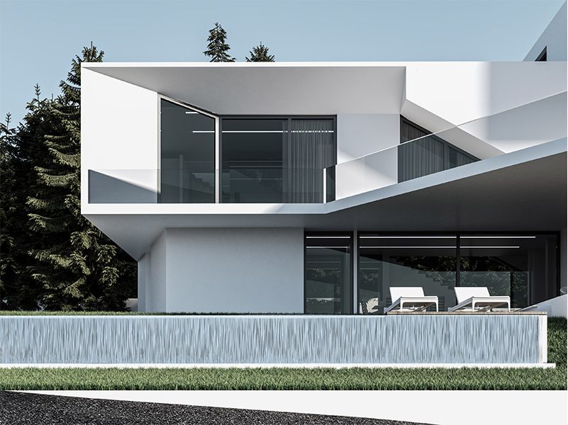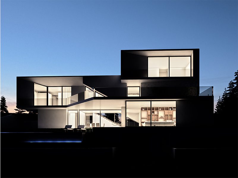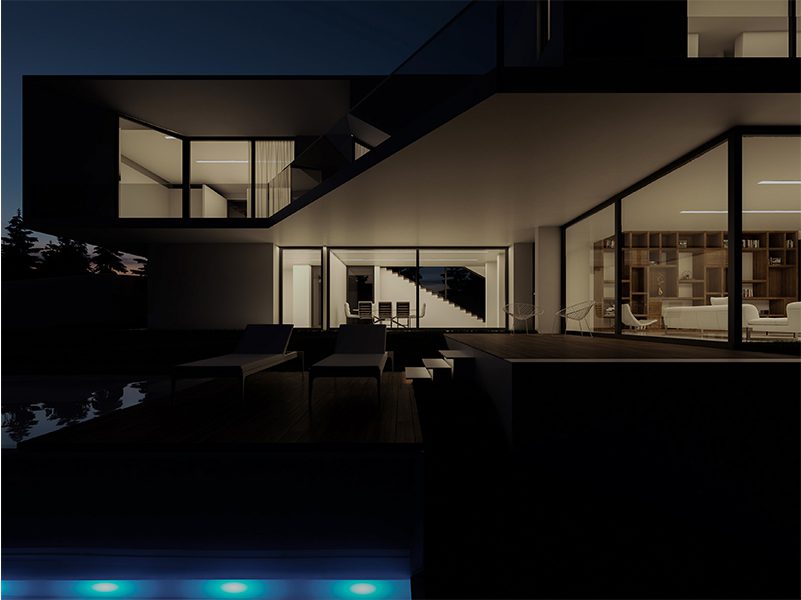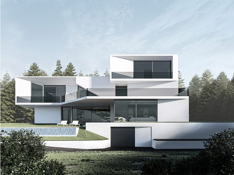 Conceived in an L shape plan around a linear pool, T villa is composed of fragmented superimposed volumes facing the view.