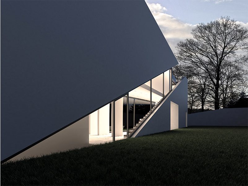 T villa emerges from its site as a sculptural white jewel , violated by an inclined open staircase, redefining the habitat in a wild context.
