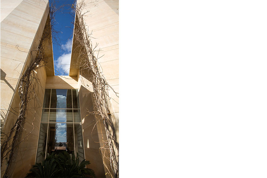 On the main façade the project boasts a strong mono-materiality from local stone that imposes itself with a strong statement, the slit in the middle, the entry through the mass, that directly leads onto a mystical Musial residential space.